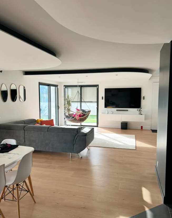 Conception d’une casquette de plafond avec finition peinture soignée. Un élément architectural fort pour structurer l’espace.