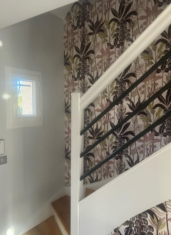 Nous avons choisi un papier peint aux motifs adaptés, peint les marches et posé le papier sur chaque contremarche avec une grande précision. Les raccords ont été soigneusement alignés pour un rendu homogène.