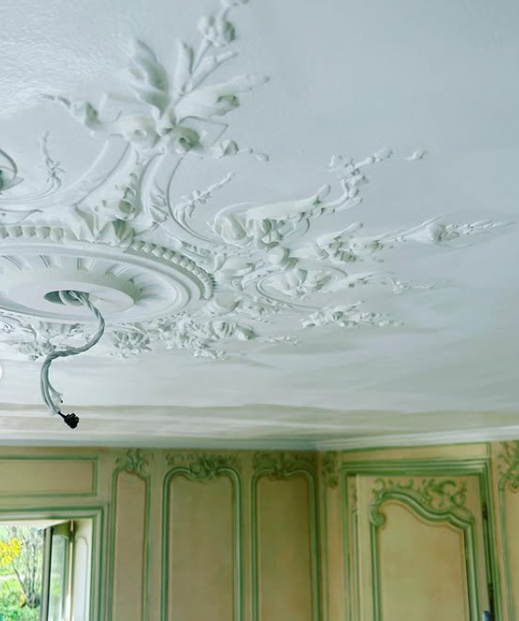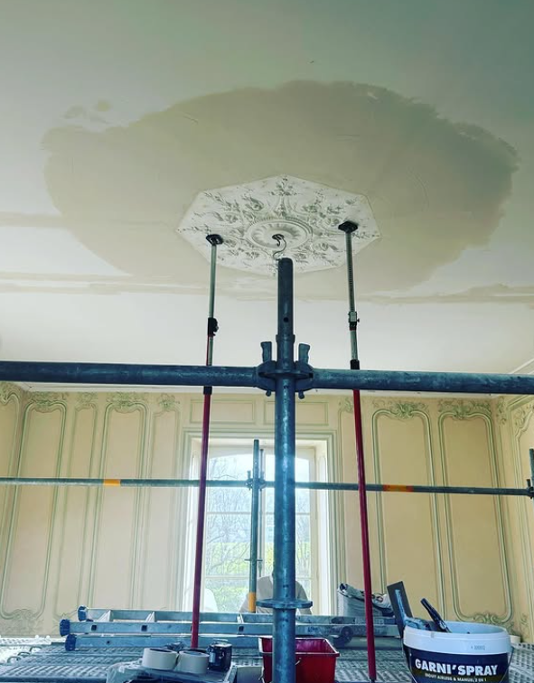 Rénovation d’un plafond dans une demeure historique avec rosace encastrée. Un résultat alliant élégance classique et respect du bâti ancien.