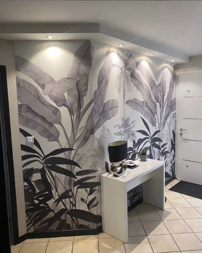 Création d’un coffre lumineux et pose d’un panoramique mural décoratif. Une entrée repensée pour plus de clarté et d’élégance.